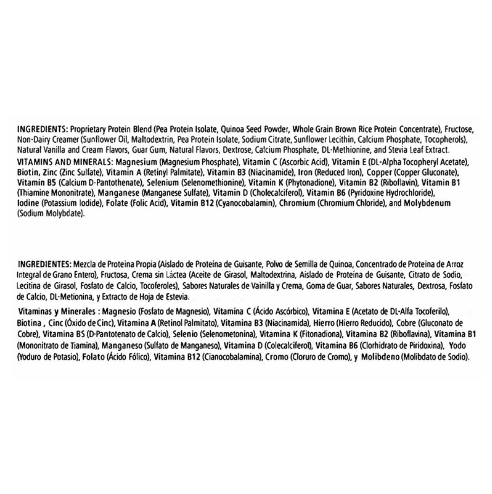 - 15 g of a high-quality, easily digestible protein blend (pea, rice, quinoa) to help sustain energy and satisfy hunger